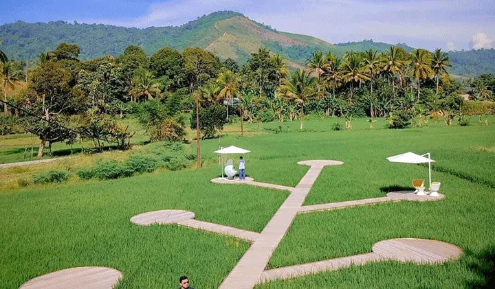 Menawarkan suasana senja romantis dengan latar persawahan dan bukit.